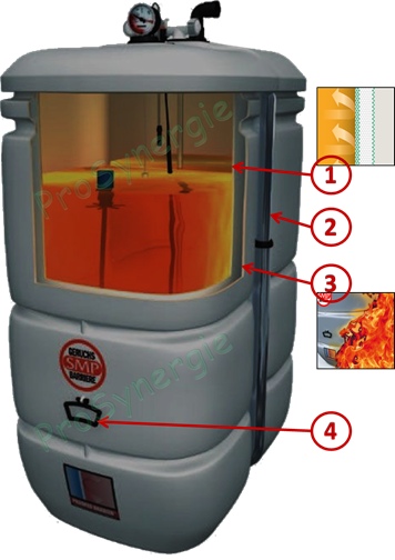 - Figure 3 n° (rep. 3) : Résistance au feu incluse Notre cuve “Intégrale” a fait l’objet de tests de tenue au feu dont elle détient le certificat (MPa Erwitte). De ce fait, elle peut être installée à 1 mètre de la chaudière.