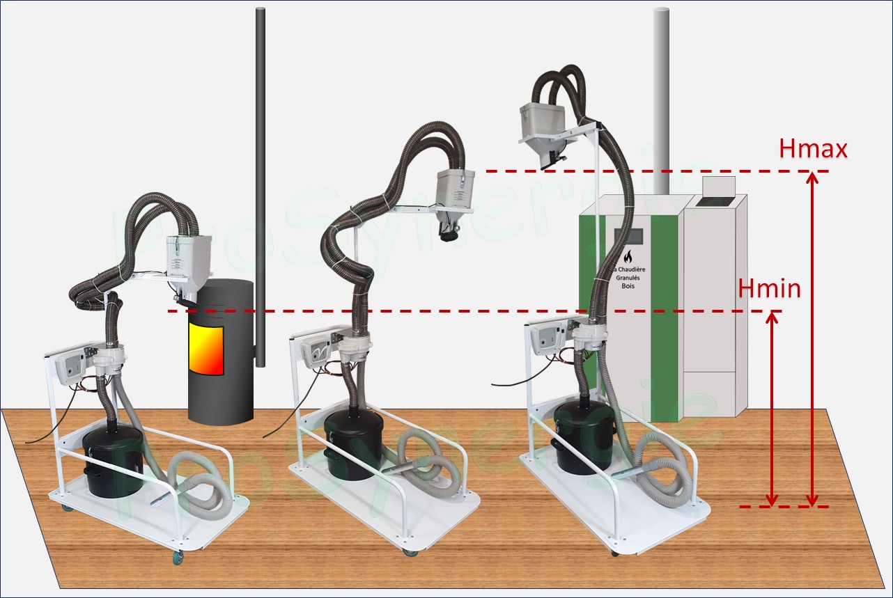 Hauteur pour atteindre une trémie de poêle ou de chaudièreHauteur maximum (passage des portes, etc...)