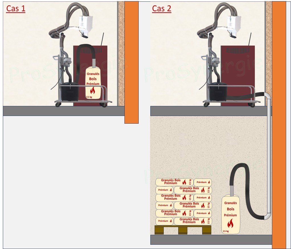 Le chariot PelloMobile est utilisé pour pomper le granulé par l'intermédiaire d'un tube traversant le plancher. Le suceur est utilisé au niveau inférieur pour vider les sacs.
