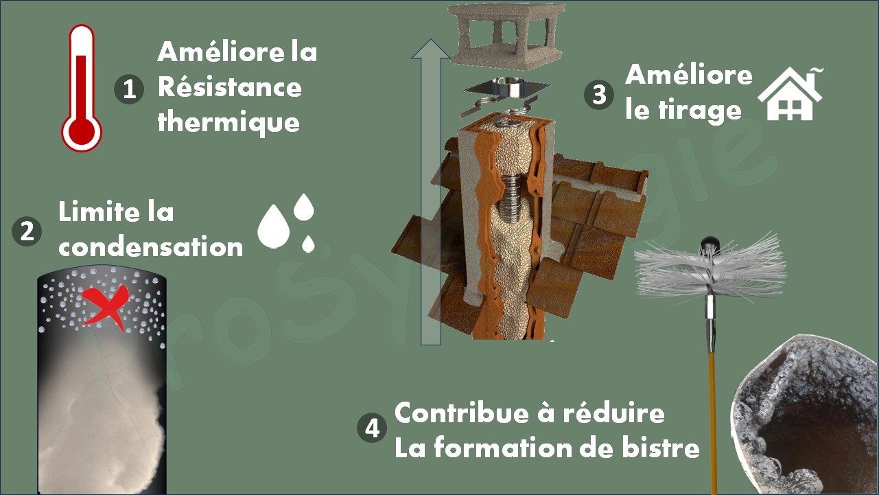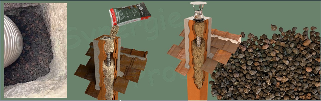 Ce procédé consiste à remplir le vide annulaire compris entre un tubage flexible métallique et un conduit de fumée individuel maçonné existant en déversant le produit dans le vide séparant le boisseau de cheminée du conduit de fumée, soit directement à partir du sac, soit à l’aide d’un seau ou d’un contenant adapté.