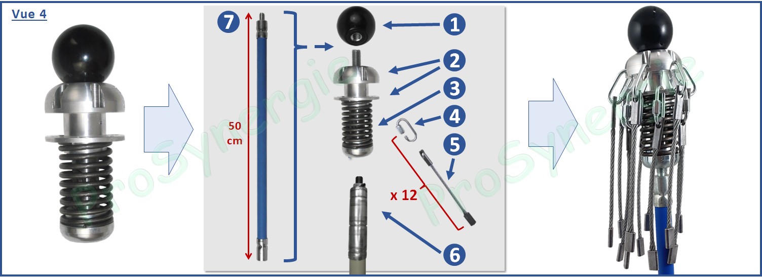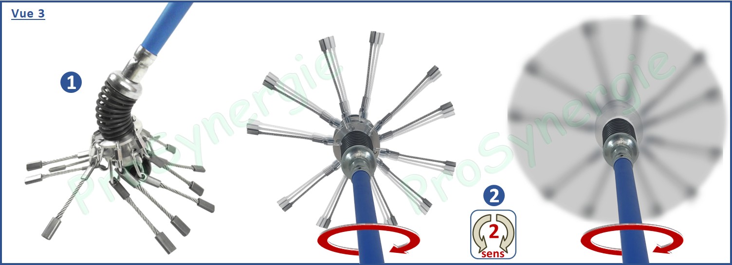 La tête du Rotonet Roue est conçue pour monter 12 mousquetons et 12 câbles. Elle est flexible pour s’adapter aux différentes configurations dans les conduits de fumée.