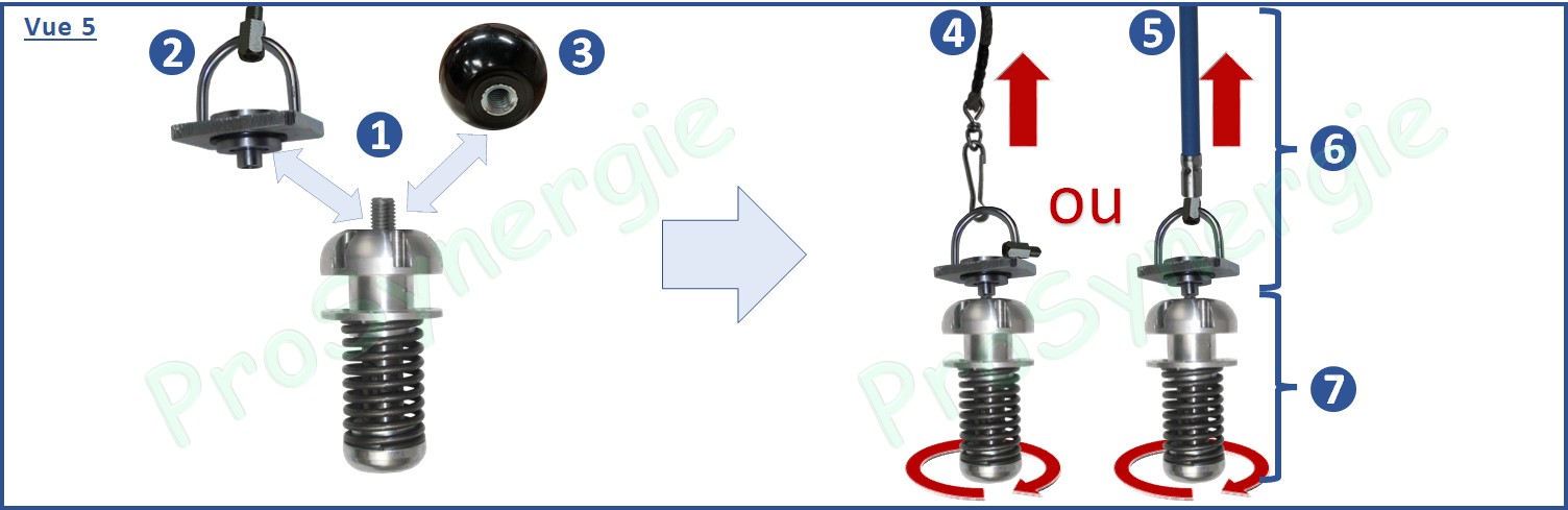 Après avoir été dévissée la boulle de la tête du Rotonet Roue, peut être remplacée par une Manille avec roulement, afin de guider la tête par le haut du conduit au moyen d’une corde ou de cannes de ramonage.