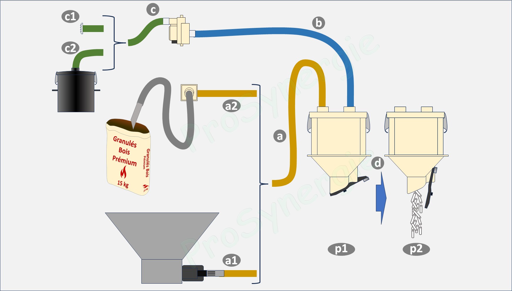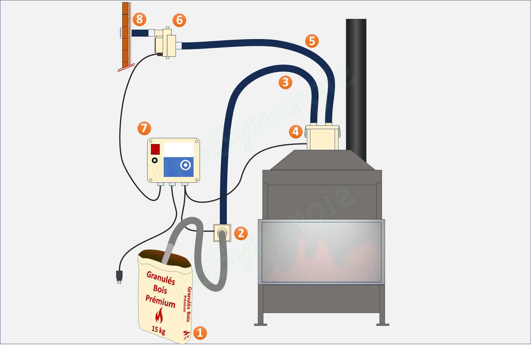 Explication du fonctionnement du Firepod pour l'aspiration de granulés (pellets) et le versement dans le réservoir de l'appareil de chauffe (insert, chaudière, etc...).