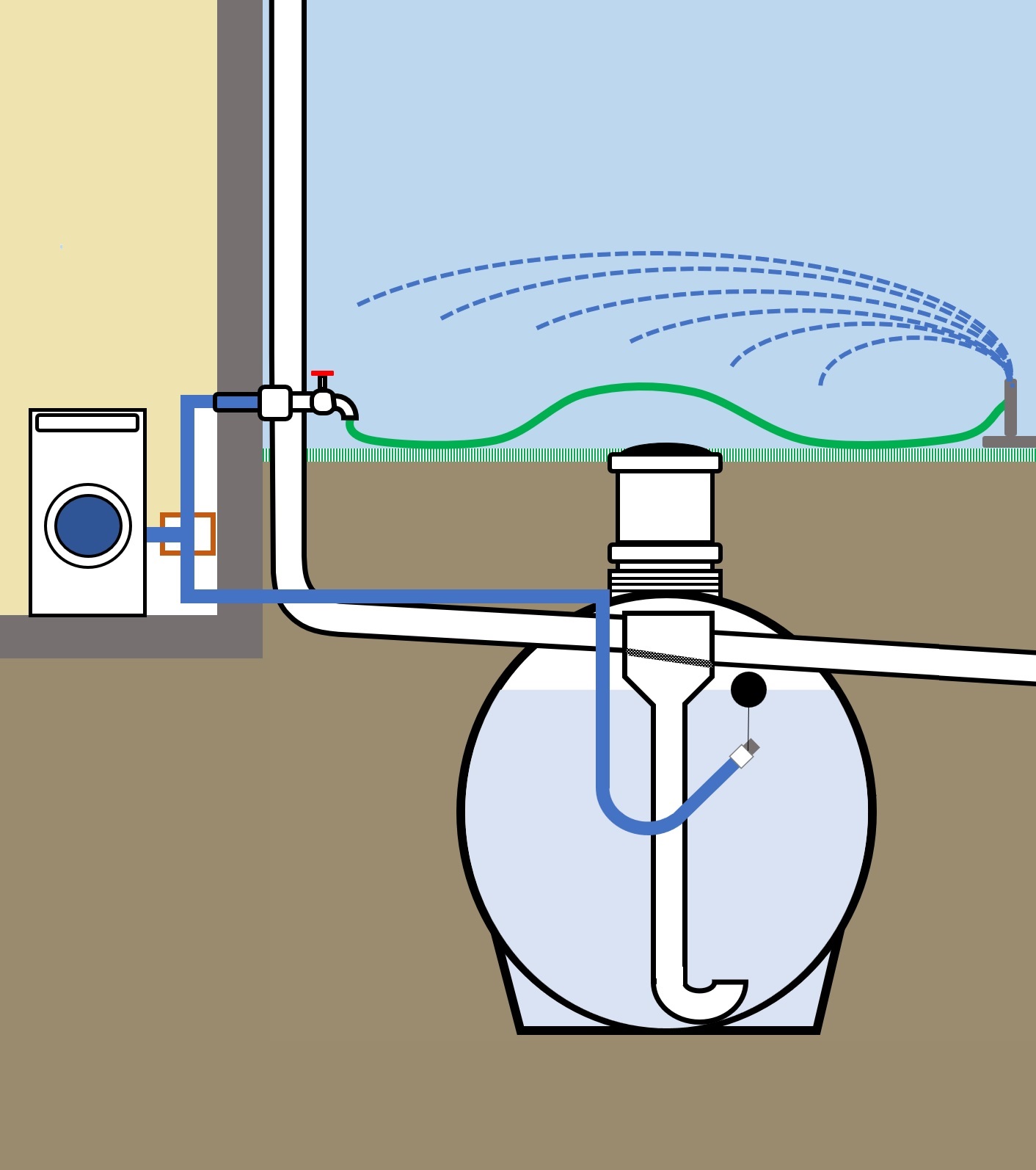 Une unité de commande composée d’une armoire électrique et d’une pompe immergée contrôle l’ensemble du système de l’intérieur de la maison. L’unité de commande a également pour tâche de déclencher la bascule sur l’eau de ville lorsque la réserve d’eau de pluie est épuisée.