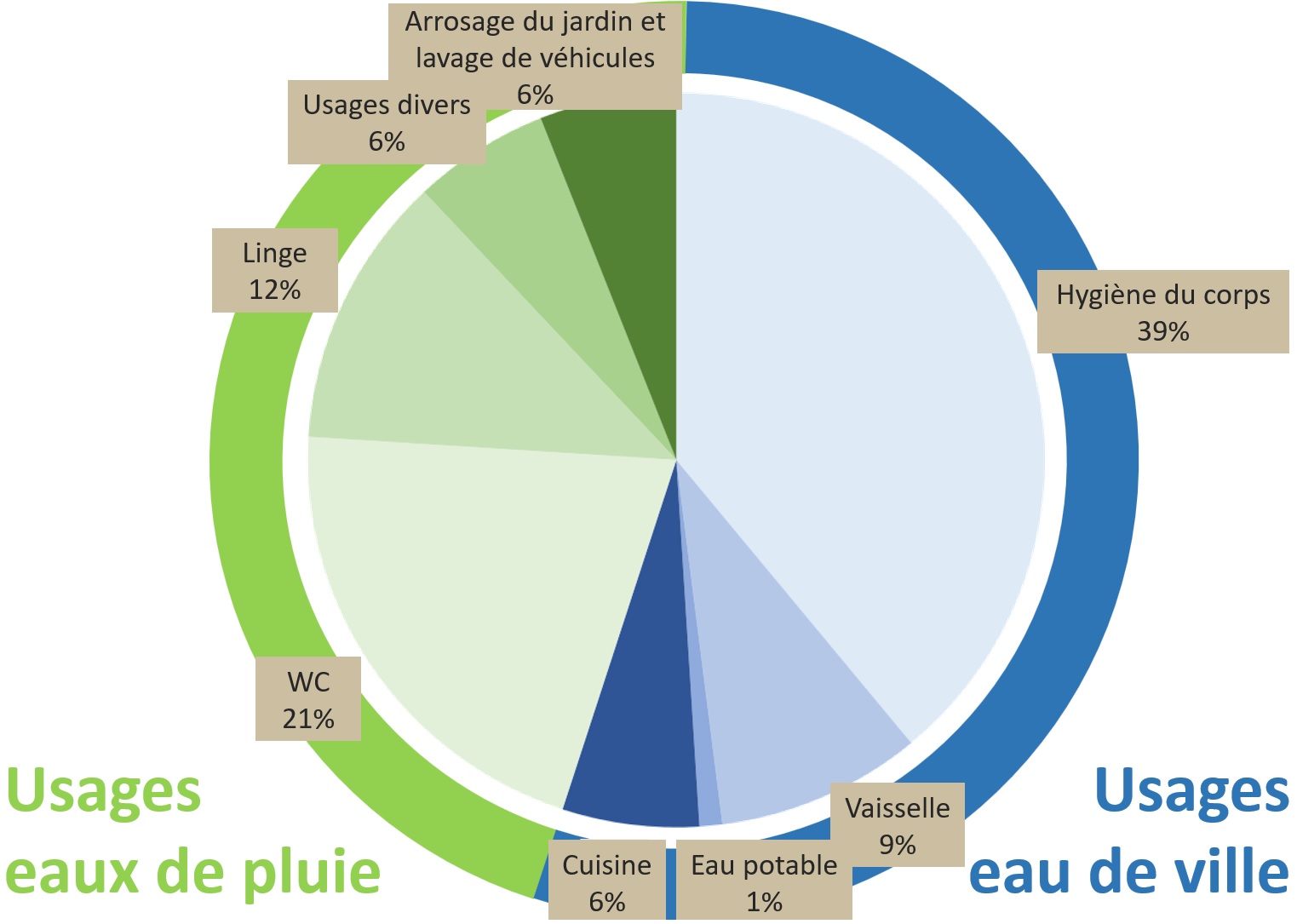 On estime que 40% de l’eau domestique hors usages extérieurs sont employés à des fonctions pour lesquelles il n’est pas nécessaire que l’eau ait des caractéristiques hygiéniques optimale (autrement dit ne soit pas de l’eau potable). Si on ajoute à ces emplois le lavage des véhicules et l’arrosage des plantes, c’est près de 50% de l’eau utilisée dans les maisons individuelles qui peut provenir de la récupération des eaux de pluie.