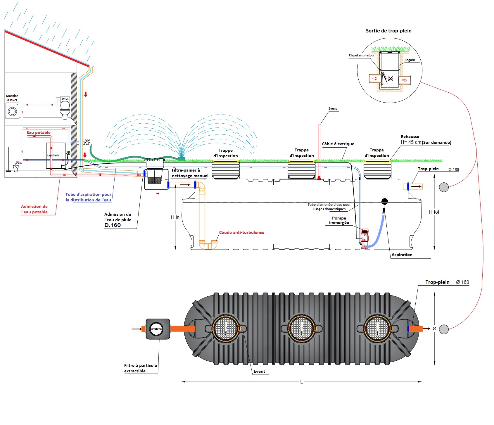 L’aspiration de l’eau se fait par un tuyau avec flotteur placé à l’intérieur du réservoir, 15 cm au-dessous du niveau de l’eau afin de prélever l’eau la plus pure.