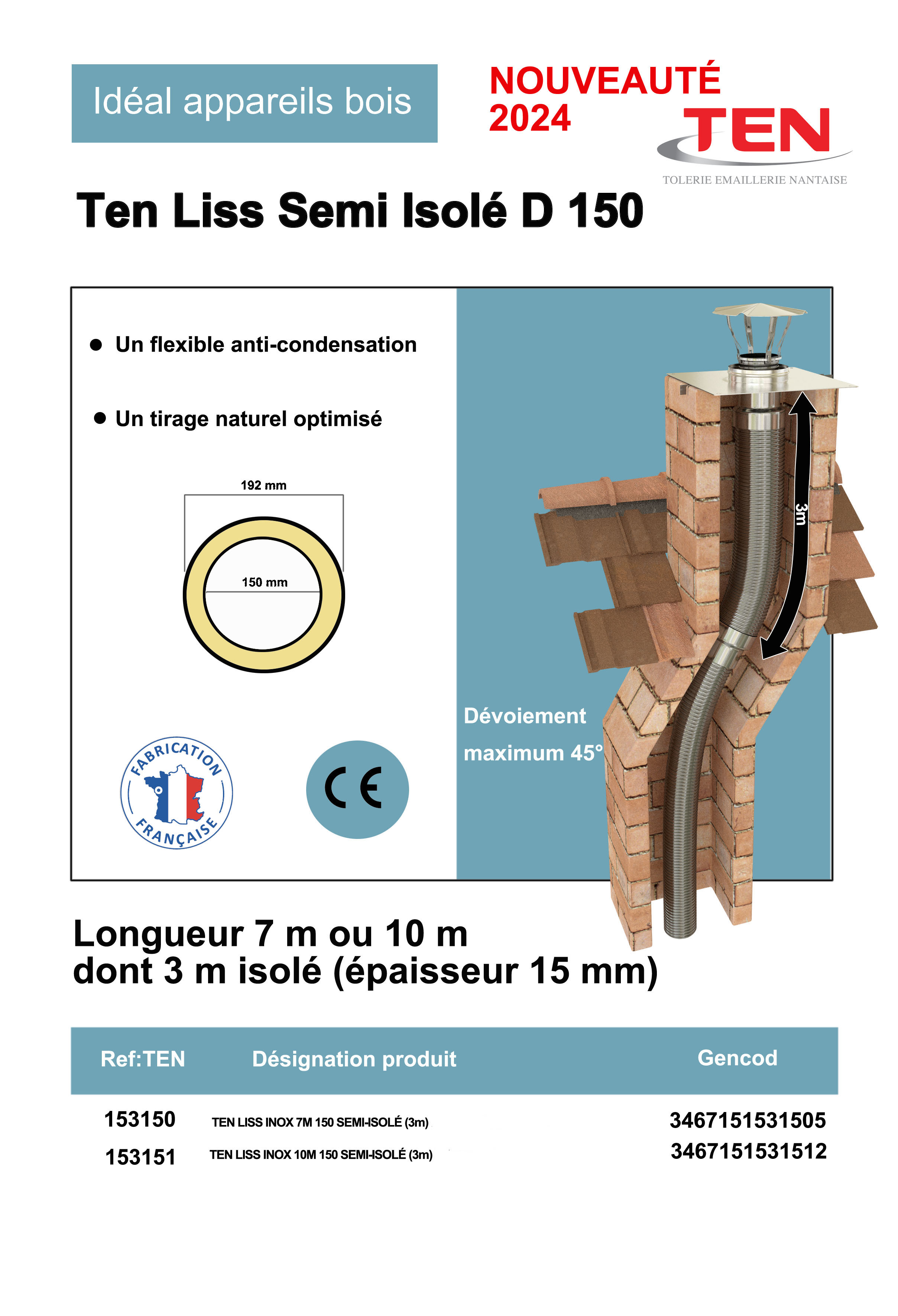 Flexible anti-condensation. Tirage naturel optimisé. Isolation en tête de cheminée sur 3 mètres. Dévoiement maximum 45°.